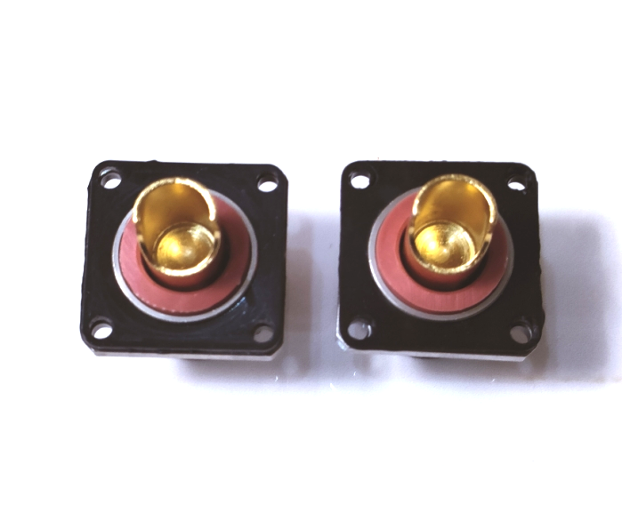 大電流無磁密封連接器,方法蘭插座,玻璃燒結工藝,金屬材料采用進口材料,燒結后無磁性,一般用于真空狀態(tài)下,大功率,大電流數(shù)據(jù)的試驗,屏蔽無干擾。單芯,兩芯已經(jīng)成熟上市,每芯電流達200A,與插頭采用卡口連接,并且有三只卡銷鎖緊,防震抗沖擊。