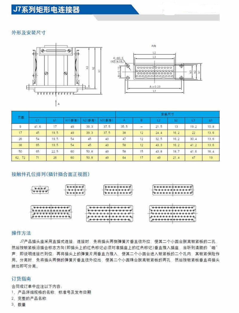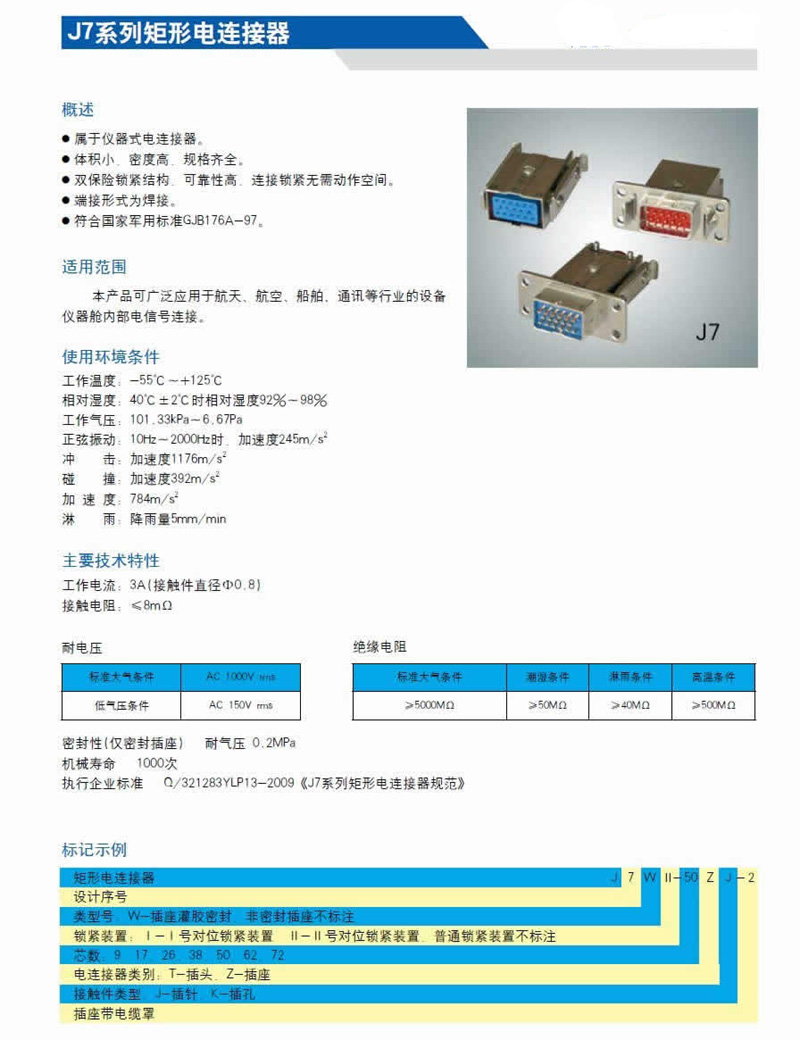 杭州航天電子-J7矩形系列航空插頭,又稱矩形連接器,矩形接插件。適用于各種電子儀器、電氣設備系統(tǒng)之間的電路連接。該產(chǎn)品為 電子元器件制造廠生產(chǎn)線認證合格產(chǎn)品;認證采用的國家 標準為GJB 176-86《耐環(huán)境線簧孔矩形電連接器總規(guī)范》。連接方式為直插連接,使用方便,可快速插拔。帶有獨特的雙重鎖緊機構,防雨,外殼屏幕,插座灌膠密封。體積小,重量輕。插孔采用高可靠性能插孔,插拔力小,使用壽命長。