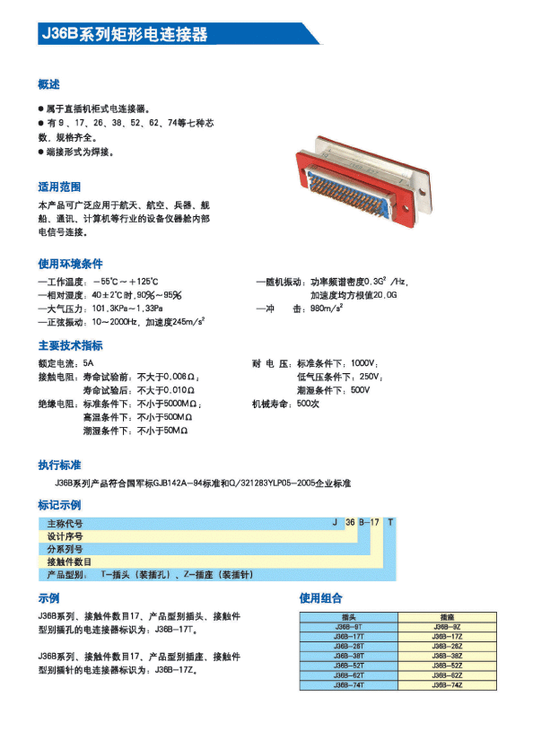 鄭州 航天電子J36B矩形航空接插件,執(zhí)行Q/HD20038-2007詳細規(guī)范,屬于直插機柜式電連接器有9,17,26,38,52,62,74等七種芯數(shù),規(guī)格齊全,其端接形式為焊接。廣泛應用于航天、航空、兵器、艦船、通訊、計算機等行業(yè)的設備儀器艙內(nèi)部電信號連接。