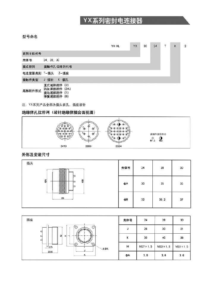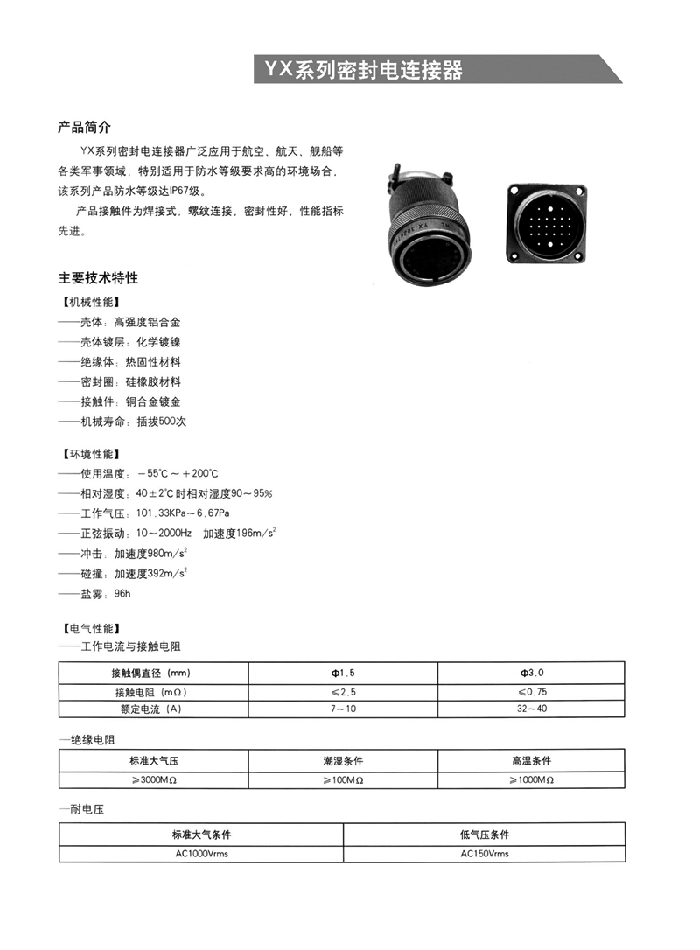 YX系列圓形防水連接器,為焊接,螺紋連接,密封性能好,性能指標先進。,廣泛用于航空、航天、艦船等各類軍事領域,特別適用于防水等級要求高的環(huán)境場合,該類航空插頭防水等級IP67級。
