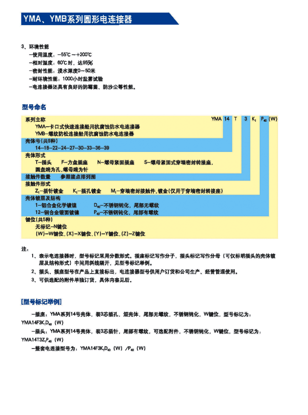 YMB水下50米防水密封圓形電連接器,適用于濕熱、浸水等惡劣環(huán)境,可耐50米水深密封,耐1000小時(shí)鹽霧試驗(yàn):YMA系列為卡口式快速連接,YMB系列圓形電連接器為螺紋防松連接,頭座均為焊接。