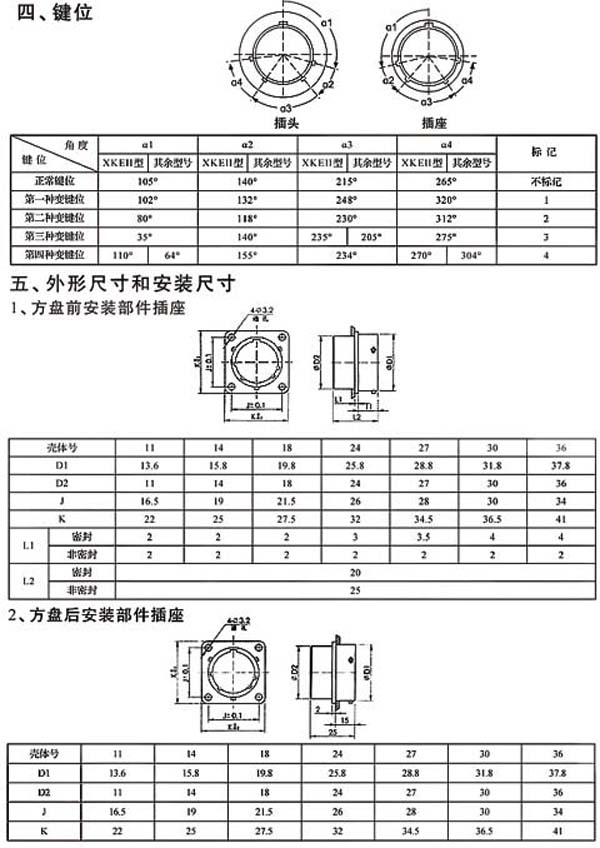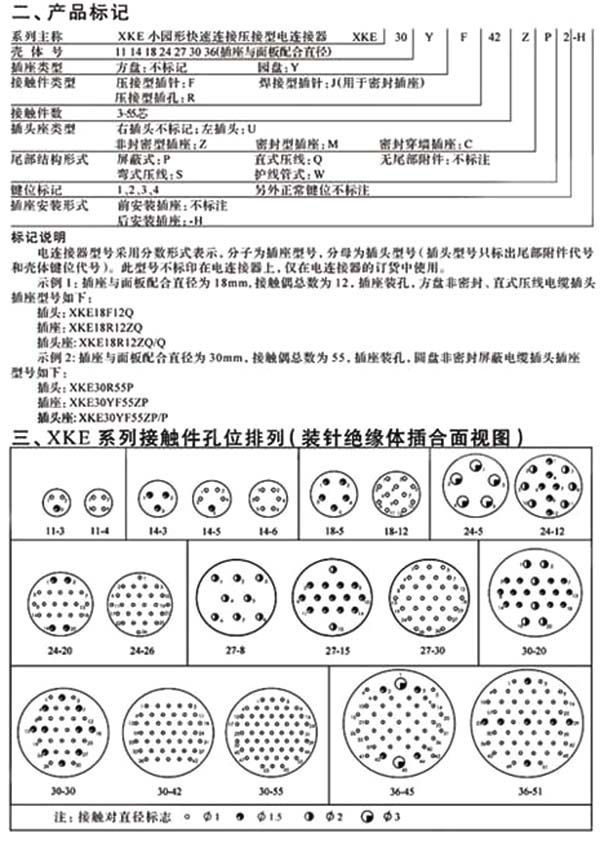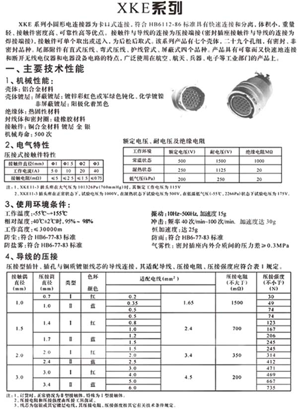 XKE系列圓形小快壓接圓形電連接器,符合HB6112-86《XKE系列小圓形快速連接壓接型插頭座》標(biāo)準(zhǔn)的要求。該系列電連接器的特點(diǎn)為卡口式連接,具有快速連接、分離、體積小、重量輕、接觸件密度高,可靠性高等優(yōu)點(diǎn).接觸件與導(dǎo)線的連接為壓接端接(密封插座接觸件與導(dǎo)線的連接為焊接端接),接觸件可單個(gè)取出或送入,為后松后取式.該系列產(chǎn)品有7個(gè)殼體,29個(gè)孔組,有密封,非密封品種.尾部附件有直式壓線,彎式壓線,護(hù)線管式,屏蔽式四個(gè)品種.產(chǎn)品具有可靠而又快速地連接和斷開(kāi)無(wú)線電儀器和電器設(shè)備電路的特點(diǎn)。