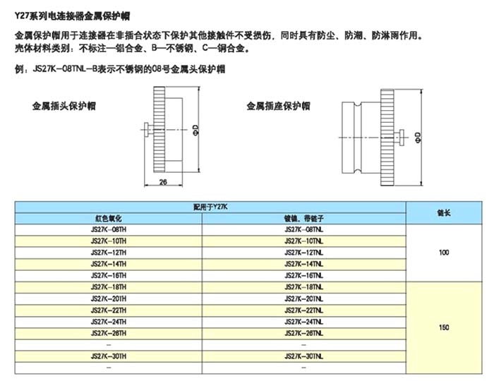 -耐鹽霧:Y27K圓形電連接器系列:鋁合金殼體96h;海軍黃銅、不銹鋼殼體:1000h