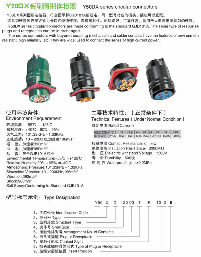 Y50DX-4芯100A圓形電纜連接器,電流大,接觸件4芯,額定電流100A,插頭與插座采用快速卡口連接,防震,防脫落,廣泛用于電源設備之間線路連接。