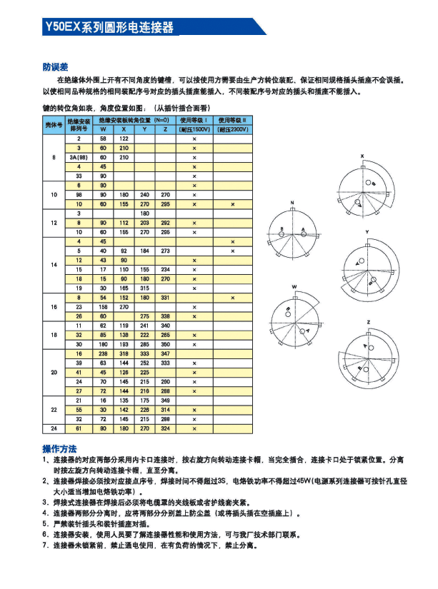 Y50EX系列航空接插件,Y50EX英制航空連接器,接插件采用卡口式連接系統(tǒng),具有快速控接和快速分離,體積小、重量輕等特點(diǎn)。插頭有多種電纜安裝形式,即:電纜夾線板式、簡(jiǎn)易封裝式、接地壓緊式、防波抗拉式、彎頭護(hù)線式、電纜話筒式和彈簧護(hù)線式等。電纜出線口備有各種規(guī)格不同的密封橡膠護(hù)線縣,能與電纜線緊密配接,增強(qiáng)了電纜線和連接器插頭的防雨、防水、防塵密封性和抗拉性能。接觸件焊接,殼體有屏蔽和非屏蔽以及多種鍍層可選,插座有一般密封和玻璃燒結(jié)密封等類觀,以適用不同的工作環(huán)境。適用于戰(zhàn)略戰(zhàn)術(shù)系統(tǒng),電子對(duì)抗系統(tǒng),野外作業(yè)電能,通訊信號(hào)連接系統(tǒng),航大航空航海通訊和測(cè)試跟蹤系統(tǒng),計(jì)算機(jī)系統(tǒng)、郵電鐵路指揮系統(tǒng),進(jìn)口醫(yī)療儀器設(shè)備等電能、電訊信號(hào)的近接。