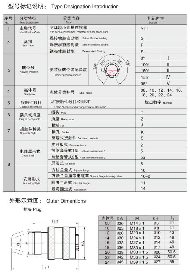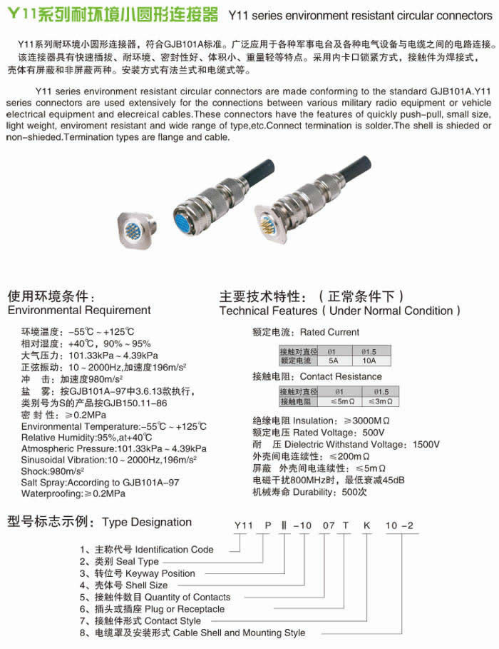Y11X圓形防水密封連接器,符合GJB101A-1997標(biāo)準(zhǔn),適用于戰(zhàn)略武器系統(tǒng)、航天衛(wèi)星系統(tǒng)、航空航海運(yùn)輸工具、地面發(fā)射和接收系統(tǒng)、高能高熱工業(yè)系統(tǒng)、工交電力系統(tǒng)等的電信號(hào)連接。 本產(chǎn)品是具有快速連接和快速分離、體積小、重量輕等諸多優(yōu)點(diǎn)的內(nèi)卡口式鎖緊的圓形電連接器。接觸件為焊接式,殼體有屏蔽和非屏蔽兩種,具有密封、防塵和防雨的性能。安裝方式有法蘭盤式、螺母拼緊式、穿墻式等。