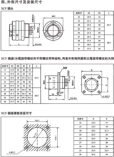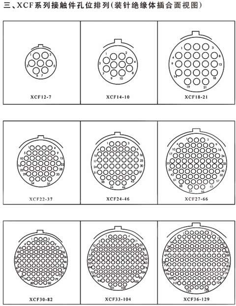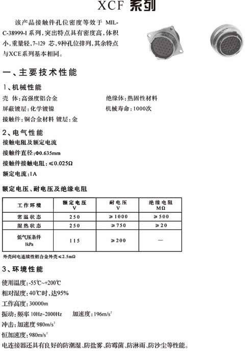 XCF圓形高密度航空電連接器,等效于MIL-DTL-38999KI系列,突出特點(diǎn)具有密度高,體積小,重量輕,7~129芯,9種孔位排列,其余特點(diǎn)與XCE系列基本相同。