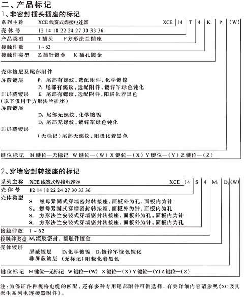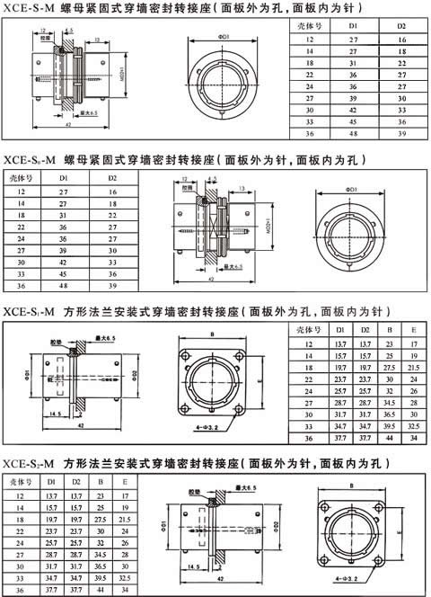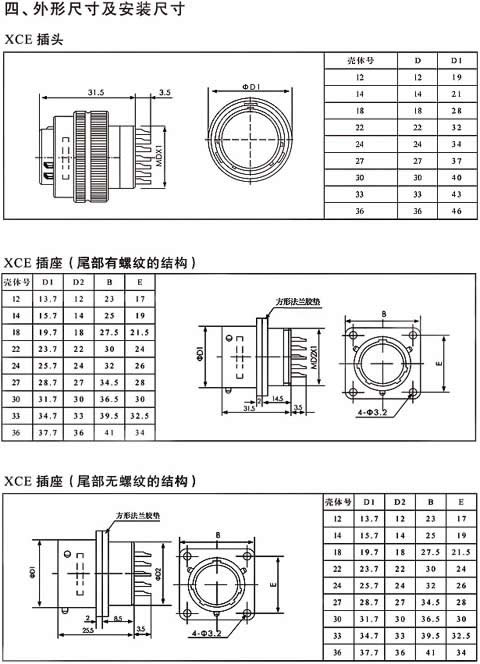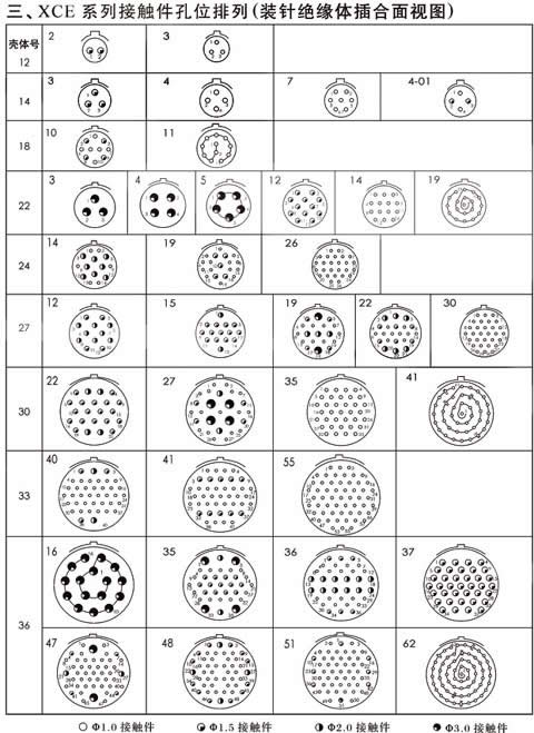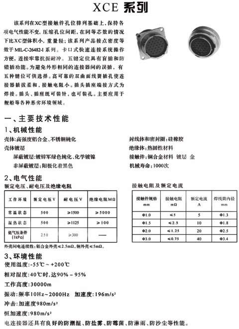 XCE系列高密度線簧插孔焊接圓形航空插頭座。適用范圍:航空、航天、艦船等軍事系統(tǒng)國防軍事工程通訊、計(jì)算機(jī)、儀器儀表領(lǐng)域。、概述:—— 線簧插孔,卡口快速連接—— 五鍵定位具有盲插和防錯(cuò)插功能—— 為避免外形相同的連接器間的誤插,有五 種鍵位可供選擇,插頭插座端接方式為焊接,插頭、插座既可裝針,也可裝孔——XCE在XC型接點(diǎn)排列基礎(chǔ)上,保持各項(xiàng) 電氣性能不變,壓縮孔位間距,在同等芯 數(shù)的情況下比XC型體積小,重量輕,接點(diǎn)排列等效于MIL-C-26482-Ⅰ——XCE系列電連接器突出特點(diǎn)是密度高體積小、重量 輕,接點(diǎn)排列等效于MIL-C-38999-Ⅰ, 接觸件 7~129芯,9種孔位排列,端接方式皆為焊接。環(huán)境性能—— 使用溫度:-55℃~+200℃—— 相對(duì)濕度:40℃時(shí),達(dá)95%—— 工作高度:30000m—— 振 動(dòng):頻率10~2000Hz 加速度196m/s2—— 沖 擊:加速度980m/s2—— 恒加速度:980m/s2 XCE航空插頭座還具有良好的防潮濕、防鹽霧、防霉菌、防淋雨、防沙塵 等性能機(jī)械性能—— 殼 體: 高強(qiáng)度鋁合金 屏蔽鍍層:鍍鋅彩虹色或軍綠色鈍化、化學(xué)鍍鎳 非屏蔽鍍層: 陽極化著黑色—— 絕 緣 體:熱固性材料—— 封線體和密封圈:硅橡膠—— 接 觸 件: 航空插頭 材 料:銅合金 鍍層:鍍銀、鍍金—— 機(jī)械壽命:1000次 .