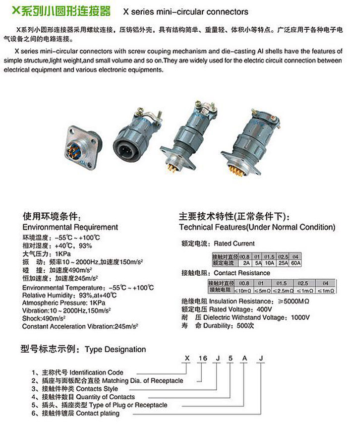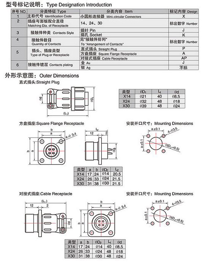 X型小圓形航空插頭,適用于儀器儀表,機械電子設(shè)備之間的線路連接。插頭與插座通過螺紋連接,結(jié)構(gòu)簡單、使用方便。安裝方式有法蘭盤式和電纜式二種 .