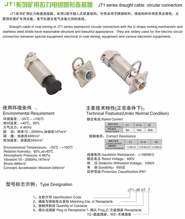 JT1系列礦用拉力電纜圓形電連接器,是煤礦滑車,煤礦設(shè)備與電源設(shè)備線路之間的連接。