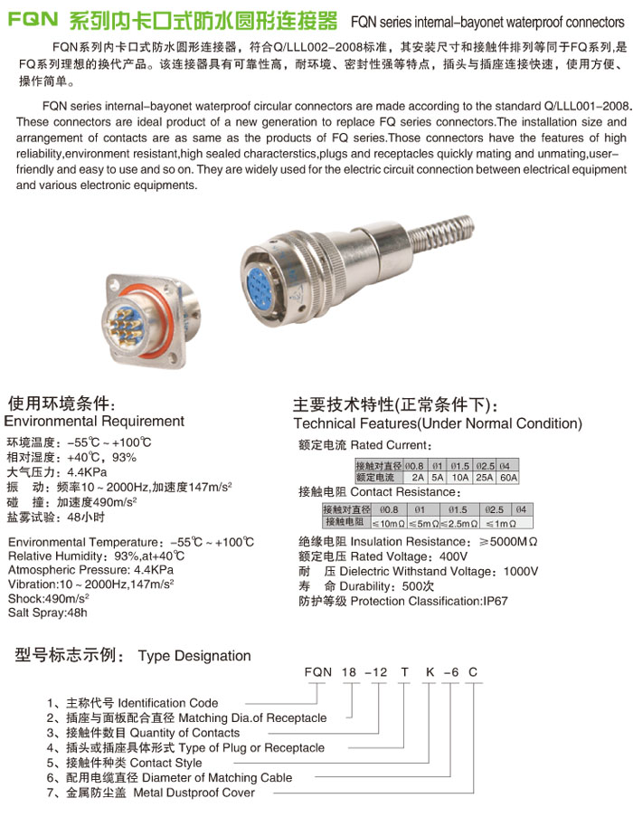FQN系列內(nèi)卡口式防水型圓形電連接器,符合Q/LLL002-2008標(biāo)準(zhǔn),產(chǎn)品價(jià)格的安裝尺寸及接點(diǎn)型譜等同F(xiàn)Q和Q系列產(chǎn)品價(jià)格,是FQ系列產(chǎn)品價(jià)格的改進(jìn)型。體積小,重量輕,內(nèi)卡口快速連接,零件由鋁棒或銅棒車加工制造(非鋁壓鑄件),耐環(huán)境,防水、防鹽霧、防霉菌,操作使用簡便。插針、插孔引線采用焊接式。產(chǎn)品價(jià)格被廣泛使用于各種電子儀器、電子、電氣設(shè)備間有防水要求的電連接中。產(chǎn)品價(jià)格符合按鐵道部標(biāo)準(zhǔn)TB/T2761。產(chǎn)品價(jià)格針、孔可以根據(jù)您的要求互換。