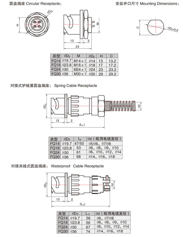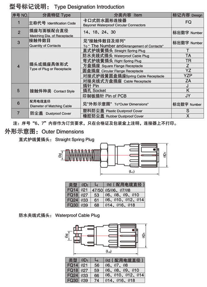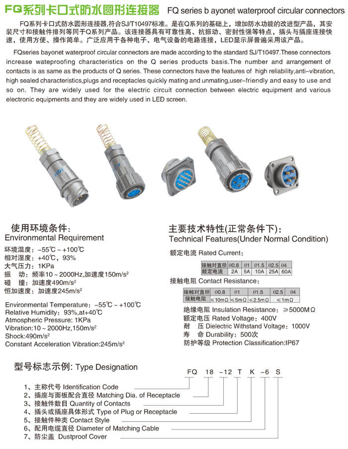 FQ 系列防水圓形電連接器符合電子工業(yè)部元器件工業(yè)管理局局標(biāo)準(zhǔn)DZ4Q/RE008-84制造,產(chǎn)品結(jié)構(gòu)先進(jìn),可靠性高,插孔接觸采用高可靠的鼠籠式彈性接觸代替?zhèn)鹘y(tǒng)的線簧結(jié)構(gòu),產(chǎn)品具有接觸電阻小、抗振動、耐沖擊、密封性強(qiáng)等特點(diǎn),插頭座連接為卡口式快速連接,使用簡單,操作方便,被廣泛應(yīng)用于各種電子設(shè)備間的電氣連接。