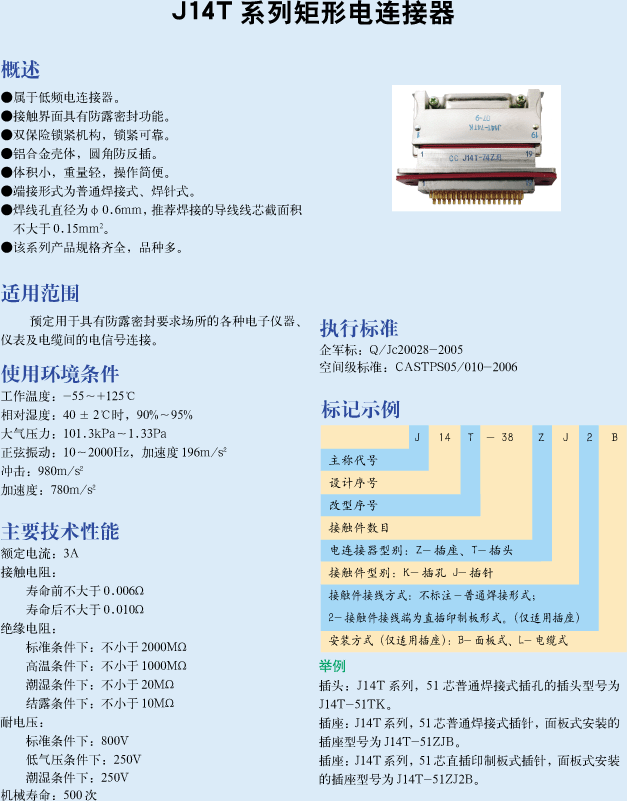 J14T矩形電連接器執(zhí)行Q/HD20037-2007詳細規(guī)范,屬于推拉式電連接器,規(guī)格齊全,有9,15,27,36,51等五種芯數(shù),端接形式為導線壓接式,頭座均有線纜引出,廣泛應(yīng)用于航天、航空、兵器、艦船、通訊、計算機等行業(yè)的設(shè)備儀器艙內(nèi)部電信號連接。