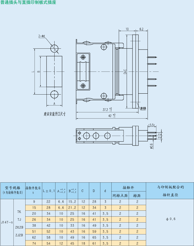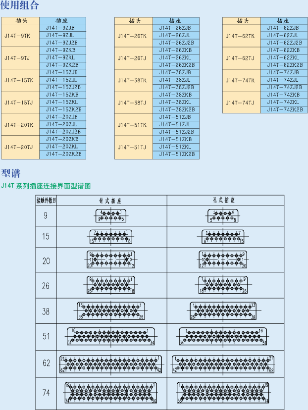 示例:J14T系列,接觸件數(shù)目為15、產(chǎn)品型別插座,接觸件型別插針,面板式安裝的電連接器標識為:J14F-15ZJB.
