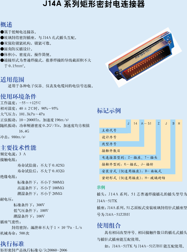 J14A-62ZK1B2/TJ矩形航空插頭座,雙保險鎖緊機構(gòu),是矩形電連接器中兼顧操作快捷、使用可靠的連接鎖緊形式。端接形式為焊接,J14P采用為非金屬化外殼,J14M為低磁型。