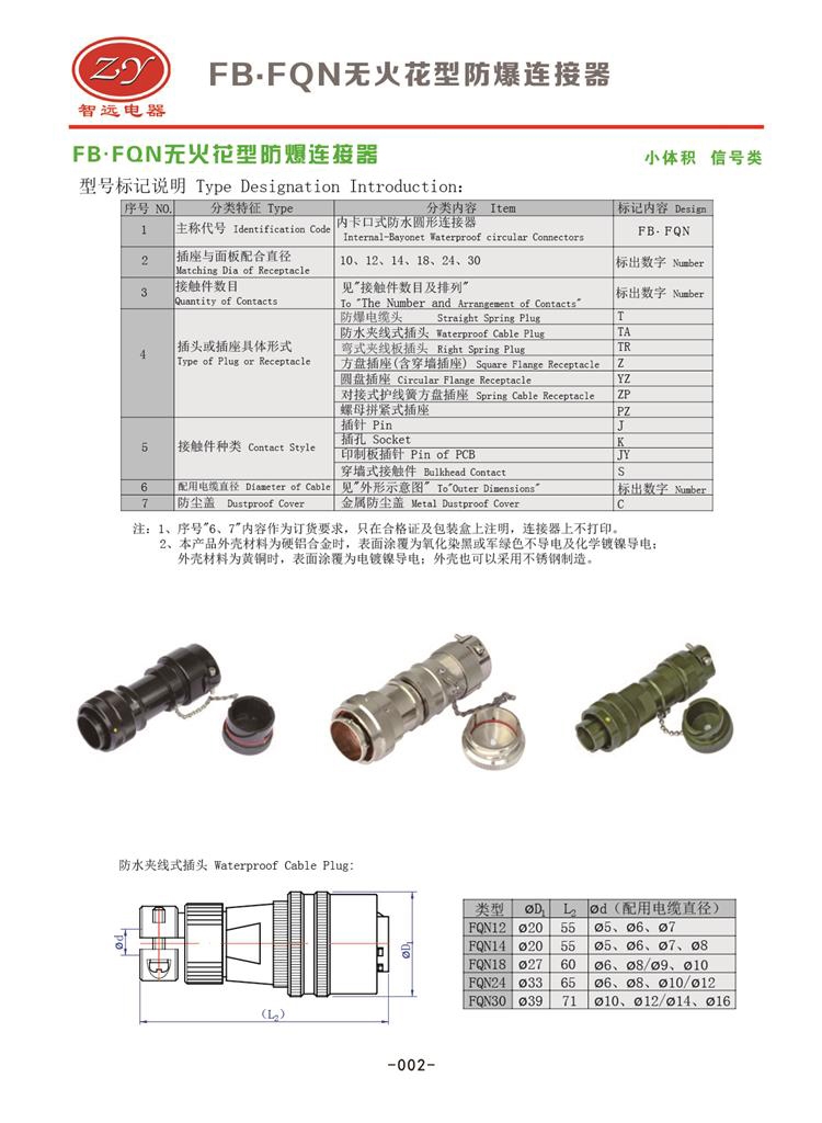FB.Y50X-1208對接式無火花型防爆插頭插座,可以接8根線,額定電流5A,螺紋連接,表面氧化著色,美觀大方,抗腐蝕性能強(qiáng),尾部雙重電纜保護(hù)。材料有鋁、銅、不銹鋼選用。插座有固定式和移動(dòng)式兩種。